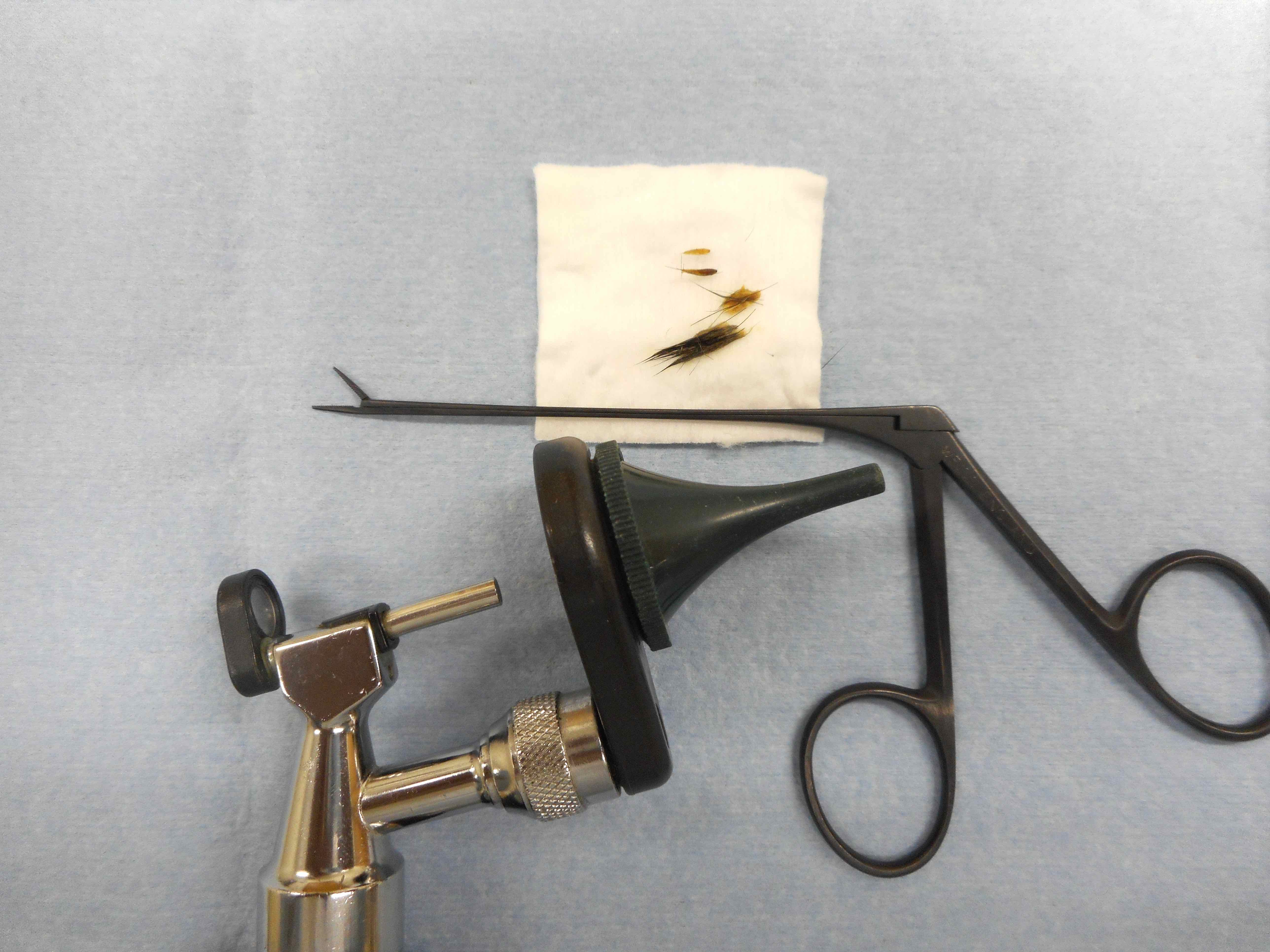 その異物を下の画像にある鉗子を使って除去することによって、その後数回の治療で正常な外耳に戻り、治療終了となりました。