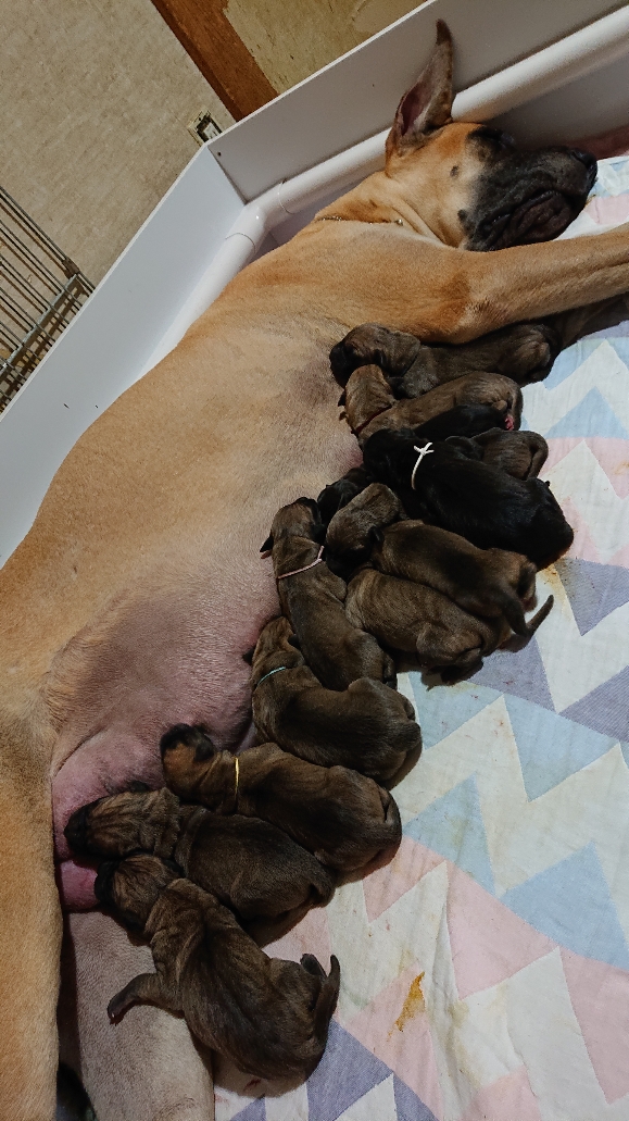 凍結精液による人工受精でも10頭位出産する多産のグレートデンを多数経験していますが14頭の出産は初めてです。