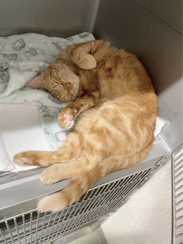 徐々に意識は回復していきましたが、今度は人に慣れていないためパニックになり、私たちに噛みついたりするようになりました。懸命な看護のおかげか痩けていた頬は徐々に丸くなり、猫らしい体つきになりました。2.6kgだった体重は現在4.75kg、やや肥満体型です。